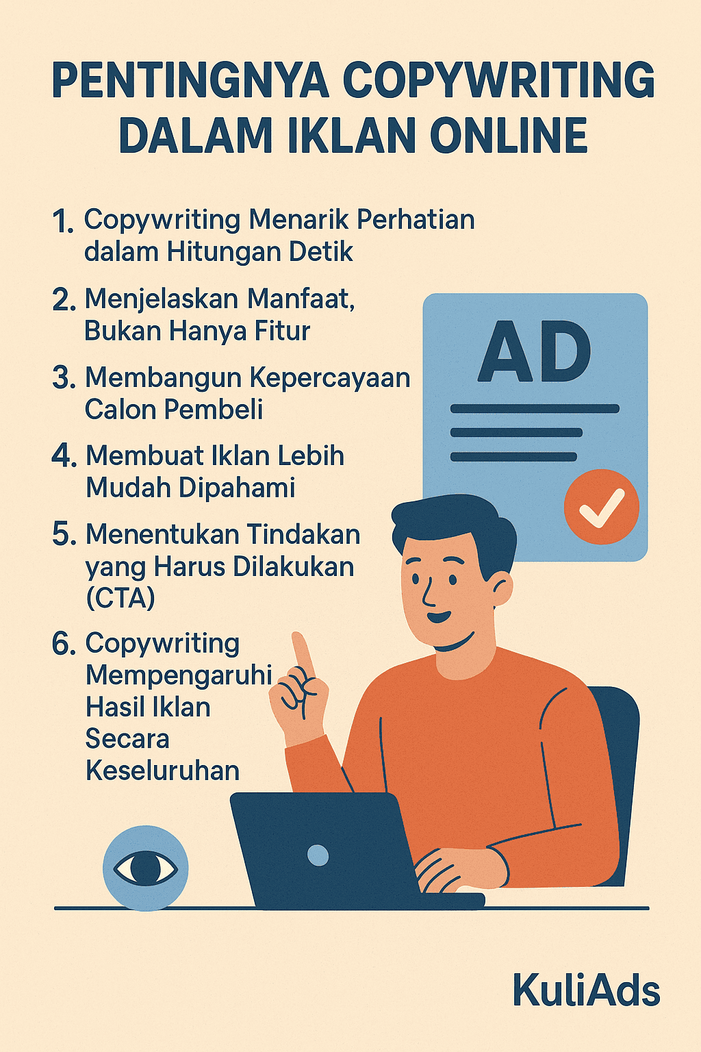 Untuk bisnis yang ingin berkembang melalui iklan online, termasuk pengguna layanan KuliAds, copywriting yang tepat bisa menjadi pembeda besar antara iklan yang menghasilkan penjualan dan iklan yang tidak memberikan hasil.